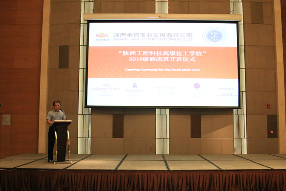 9月12日,我校在西安皇冠假日酒店召开了2018级酒店管理班开班仪式。此班级是陕西金信实业发展有限公司和学校按照陕投集团“攻坚扶贫”的要求,以“技能扶贫”的方式在商洛市山阳县、丹凤县招录的。为了体现班级特色,此次开班仪式在金信公司下属的酒店举行。